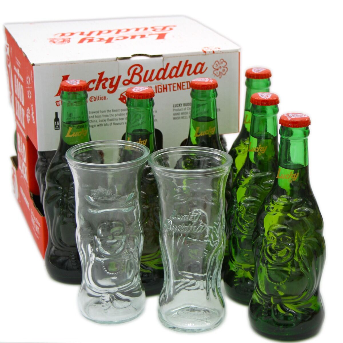 Contains 6 x 330ml Lucky Buddha Bottles of Beer + 2 x Lucky Buddah branded glasses (Collectable) These are the glasses that will be on the antiques roadshow of the future.